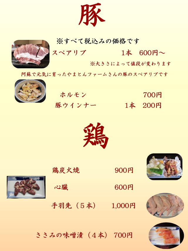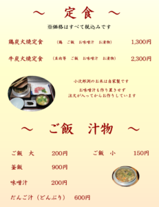 ※上記メニューの他にも、炭火焼単品、一品料理、お飲み物とこだわりの品を厳選いたしました。こころ温まるメニューをご用意しておりますので、ごゆっくりお召し上がりください。