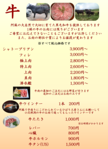 阿蘇の大自然で3年位肥育された牛を提供いたします。安心・安全をモットーに、皆様に美味しく食べてもらいたい。そんな思いでスタッフが真心を込めておもてなしします。